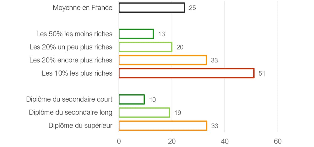 Prenons l’exemple de la France : voyager en avion est loin d’être une pratique commune, elle demeure l’apanage des plus aisés et des plus diplômés. Ainsi, plus de la moitié des 10 % des Françaises et des Français les plus riches prend l’avion au moins une fois par an, contre 13 % des 50 % les plus pauvres. C’est le cas d’un tiers des personnes diplômées de l’enseignement supérieur, contre 10 % des moins diplômées.