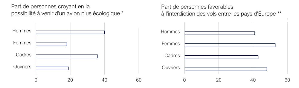 Gauche : Pourcentage d’individus ayant répondu « Oui, tout à fait » à la question : Croyez-vous à la possibilité qu’il existe un jour un avion plus écologique, moins émetteur de CO₂ ? (Source : IFOP-Fondation jean Jaurès, 2022). Droite : Pourcentage d’individus déclarant être très ou assez favorables l’interdiction des vols entre deux villes européennes dès 2026 pour réduire les émissions de carbone. ELABE et BFMlV, 2022. Fourni par l'auteur.