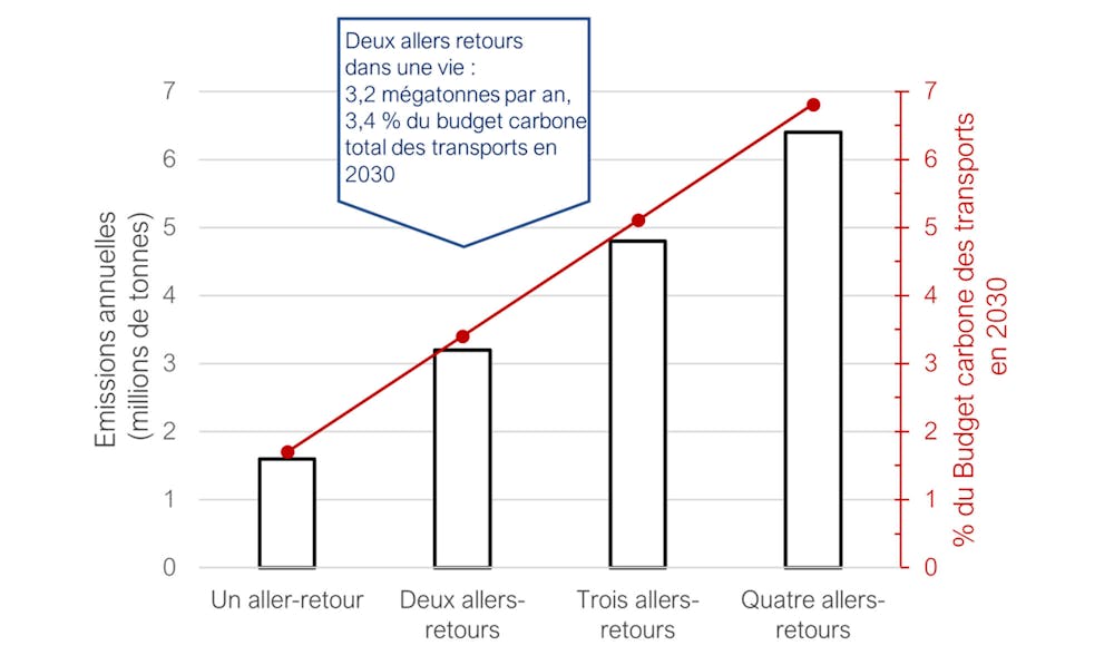 Cela pèserait d’autant plus au fil des années, le budget carbone diminuant : ces vols équivaudraient à 5 à 10 % du budget carbone total de la France en 2050.
